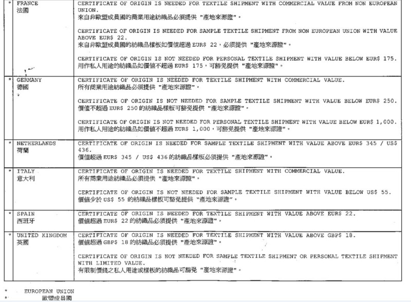 通知(zhī),紡織品貨件寄住相關歐盟國家需要原産地證(