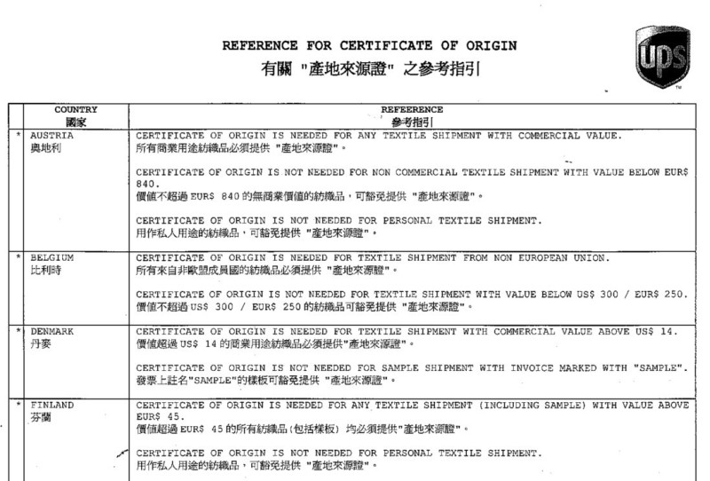 UPS 寄往歐盟國家需随貨CO的要求!